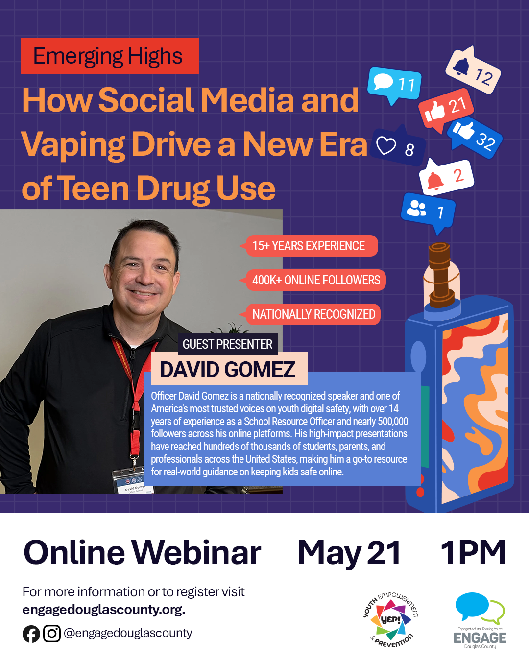 Join Engage Douglas County for a free, eye-opening webinar featuring youth prevention expert Officer David Gomez — and learn what every parent, educator, and community member needs to know right now.